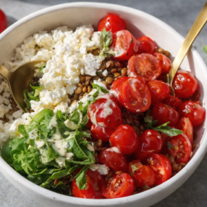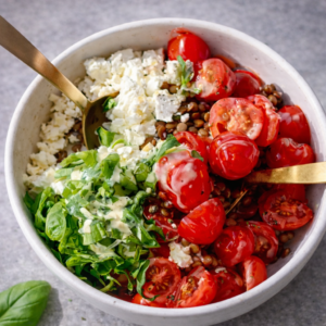 - Die Linsen zusammen mit den Tomaten, Feta & Basilikum in eine Bowl geben. Mit Salz und Pfeffer würzen.
