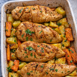 Gebackenes Hähnchen mit Kartoffeln und Karotten